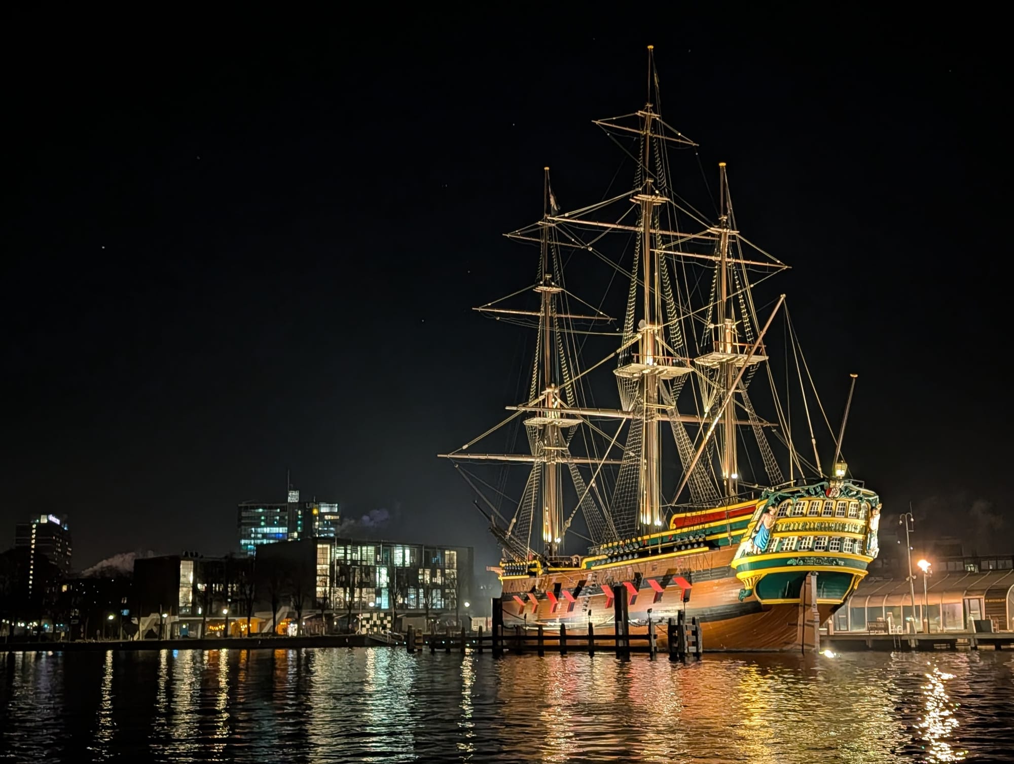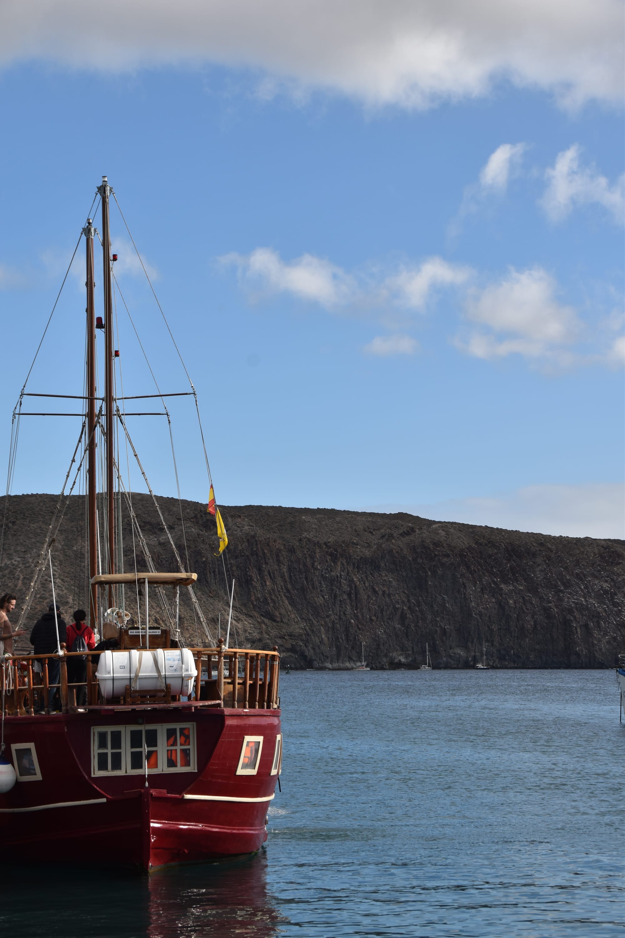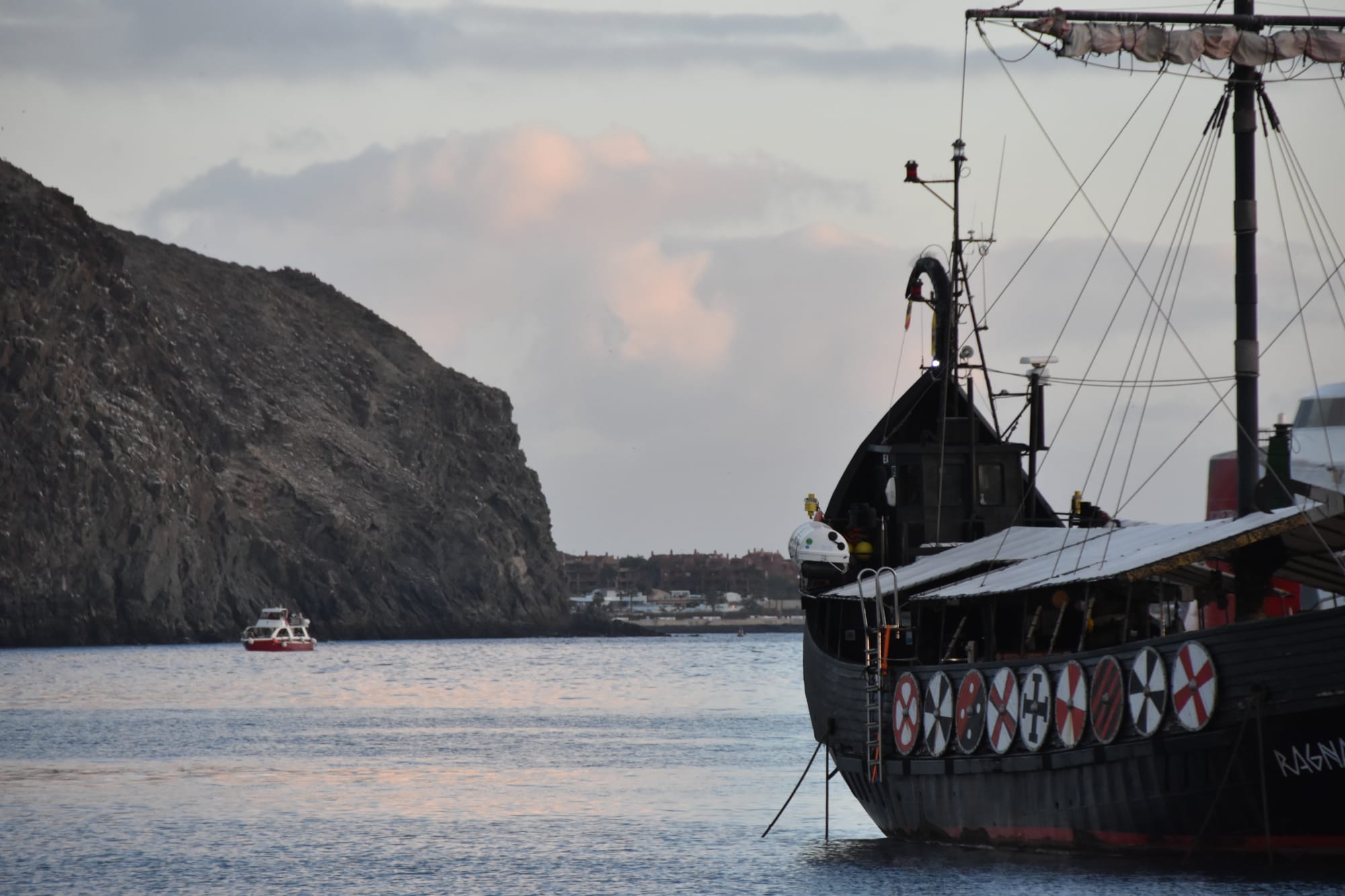 After a late lunch and some wandering around, we watched these surfers catching the last of the evening waves. This was a truly beautiful moment. The sunset was gorgeous, the surfers were entertaining, and a busker nearby was playing some soft guitar. Lovely!The following day was dedicated to sheer laziness. I slept in, read a book by the beach, and generally just lounged. I'm always keeping myself busy, and as much as I love adventuring and socializing, it's also great to set aside a day to just relax.Once again, the sunset didn't disappoint. My day of relaxation was successful!After my day of relaxation, Justin booked us a whale watching excursion from Los Cristianos. Naturally, we chose to set sail on the pirate ship! Arrrr, mateys!Due to some insane traffic near the port, we ended up missing the intended departure. Luckily, Justin was able to call and reschedule us onto a later departure. So we relaxed by the beach for a while before heading out to whale watch.Here's a shot of a competitor's boat, this one themed like a viking ship.I was feeling pretty confident about my Spanish, but this was a humbling experience. In an attempt to simply order two beers, I somehow blundered and ordered a sangria. In an attempt to correct that mistake, I somehow ordered a nonalcoholic San Miguel. Finally, the third try was the charm and I managed to get us both a couple of beers! I think my bad Spanish was partly at fault, but I do think the waitress was partly at fault here as well.