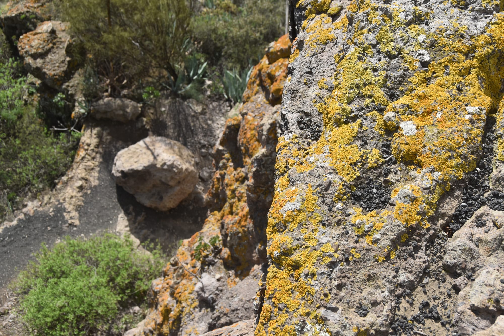 On our way into the islands, we spent a day in Amsterdam. We managed to cram quite a lot of activities into this single night, including a canal tour. We got lucky and happened to be there during the weekend kickoff of the Festival of Lights, which made for some nice sightseeing.After Amsterdam, it was off to the islands! Justin was still dealing with jet lag, but I wasted no time getting out and exploring. Some folks from the hostel were going on a hike to Pico de Bandama, a caldera that was accessible by bus. Here's a photo from the trailhead.The caldera was super interesting, and offered a pretty wild variety of textures and scenery. It was also really lush, thanks to some serendipitous rain storms that were going on the week or two before we arrived. So we had some really lucky timing on this part.Here's another interesting photo I captured from the caldera, highlighting the really lush greenery coupled with the striking textures and colors on the rocks.