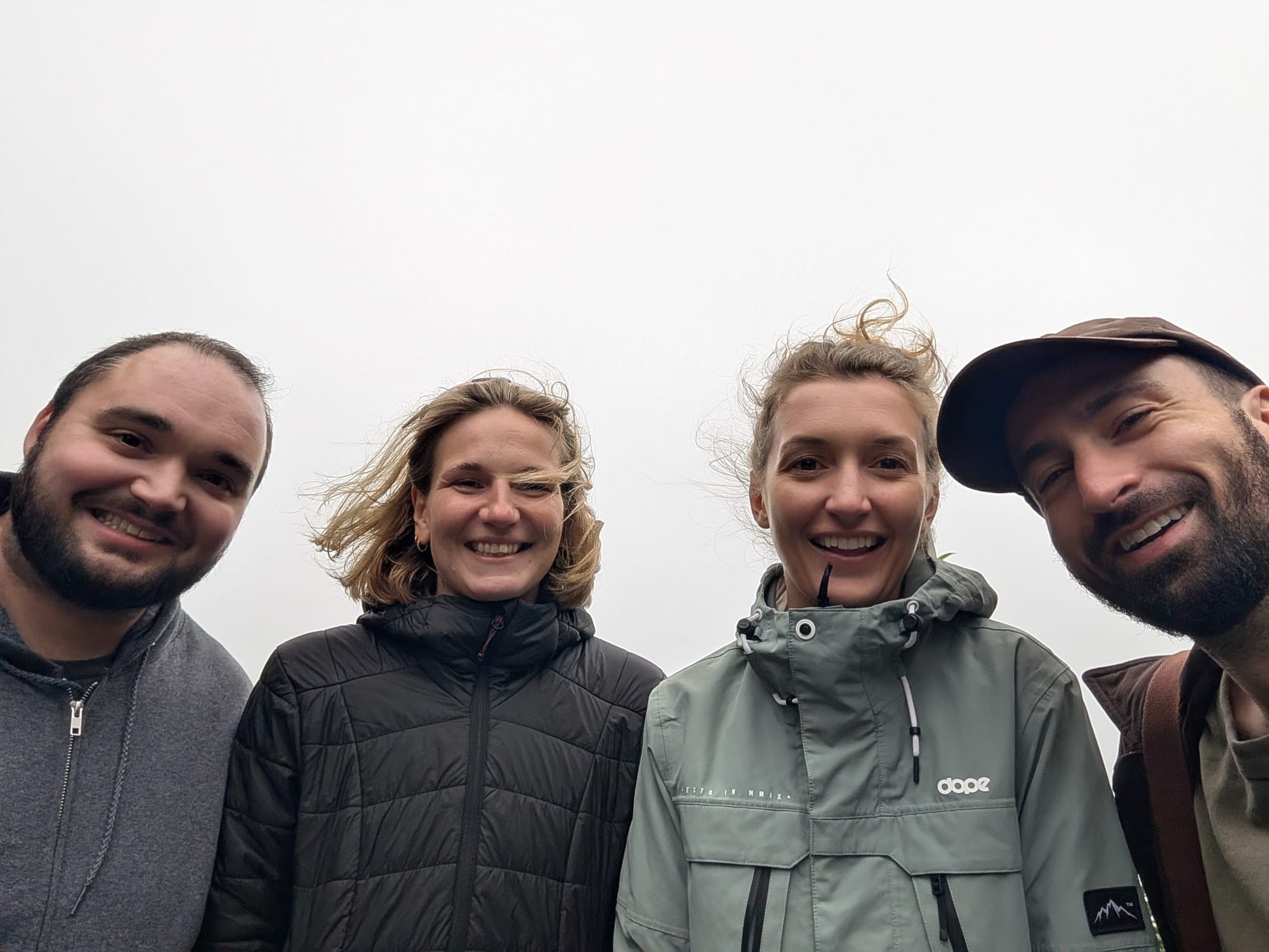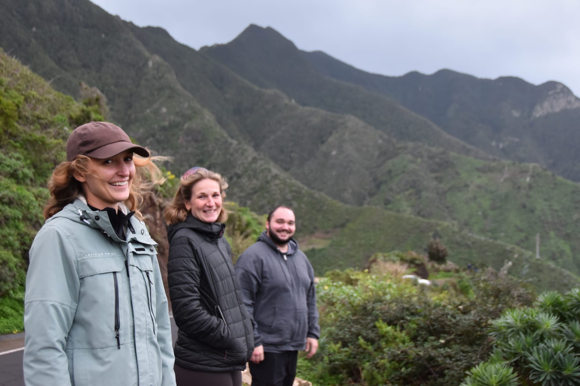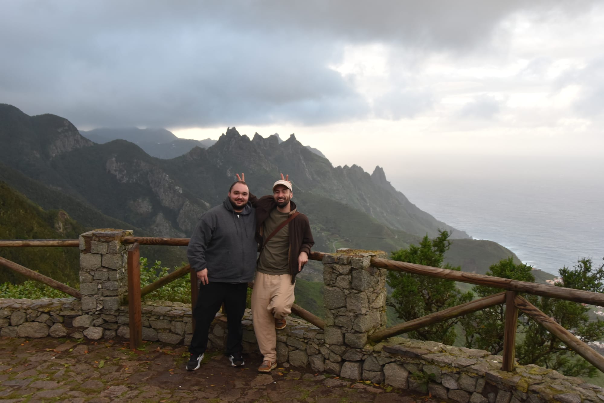 Flights to Tenerife were serviced by relatively small propeller planes, and thanks to some rough storms the turbulence was...exciting. At one point the whole plane suddenly seemed to hit a wall of air and drop roughly a foot, which was terrifying!Our Airbnb had a washer, but no dryer. I didn't realize the missing dryer until it was too late, and all my clothes were soaking wet. In order to have something to wear for the day, I resorted to drying them in the oven. That gave me a good giggle - there's a first time for everything, and I wonder if I'm the first to do this?Here's a photo, not too far from me and Justin's Airbnb. We were staying in a relatively rural area near the town of Pedro Alvarez.The first day in Tenerife, we met up with Sarah and Sonja. We had met Sarah in the first hostel, and she was following a nearly identical itinerary as us! The weather in the northern part of the island was cold and overcast, so we went for a road trip sightseeing tour. The whiteout from the clouds made for some fun photos, like this selfie into nothing.Sarah captured this funny photo of the three of us, all seemingly looking in different directions at absolutely nothing. Silly times!Luckily, the total whiteout didn't last the entire day. As the weather started to clear up a bit, we were greeted with some really amazing views.The whole gang, out for sightseeing!And, of course, stopping long enough to goof around with my good friend.