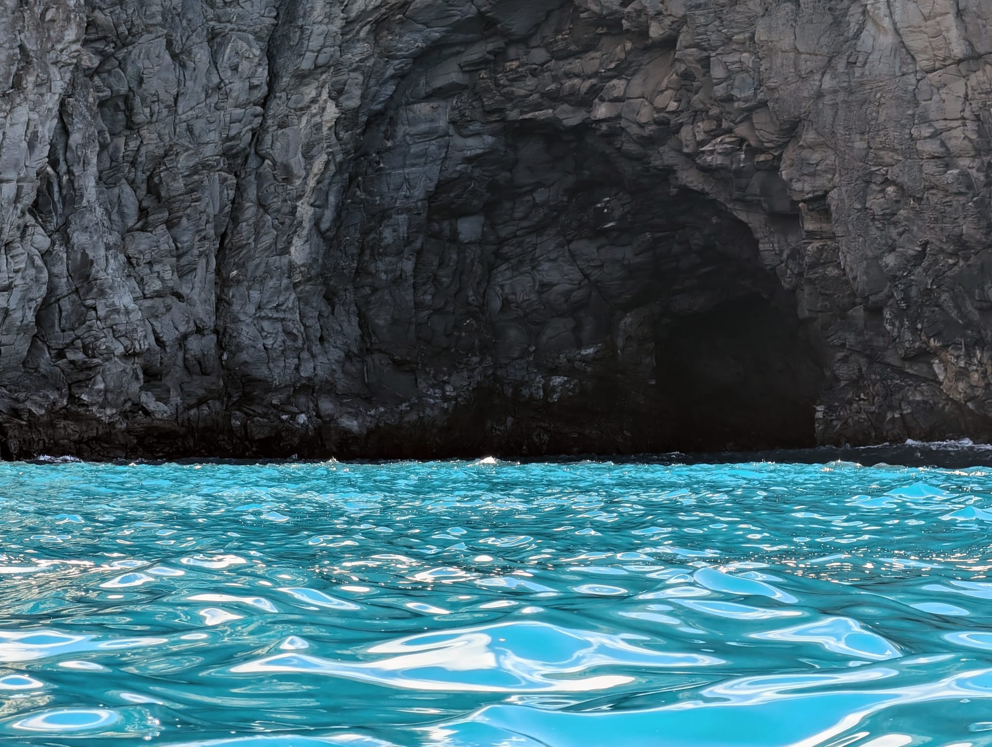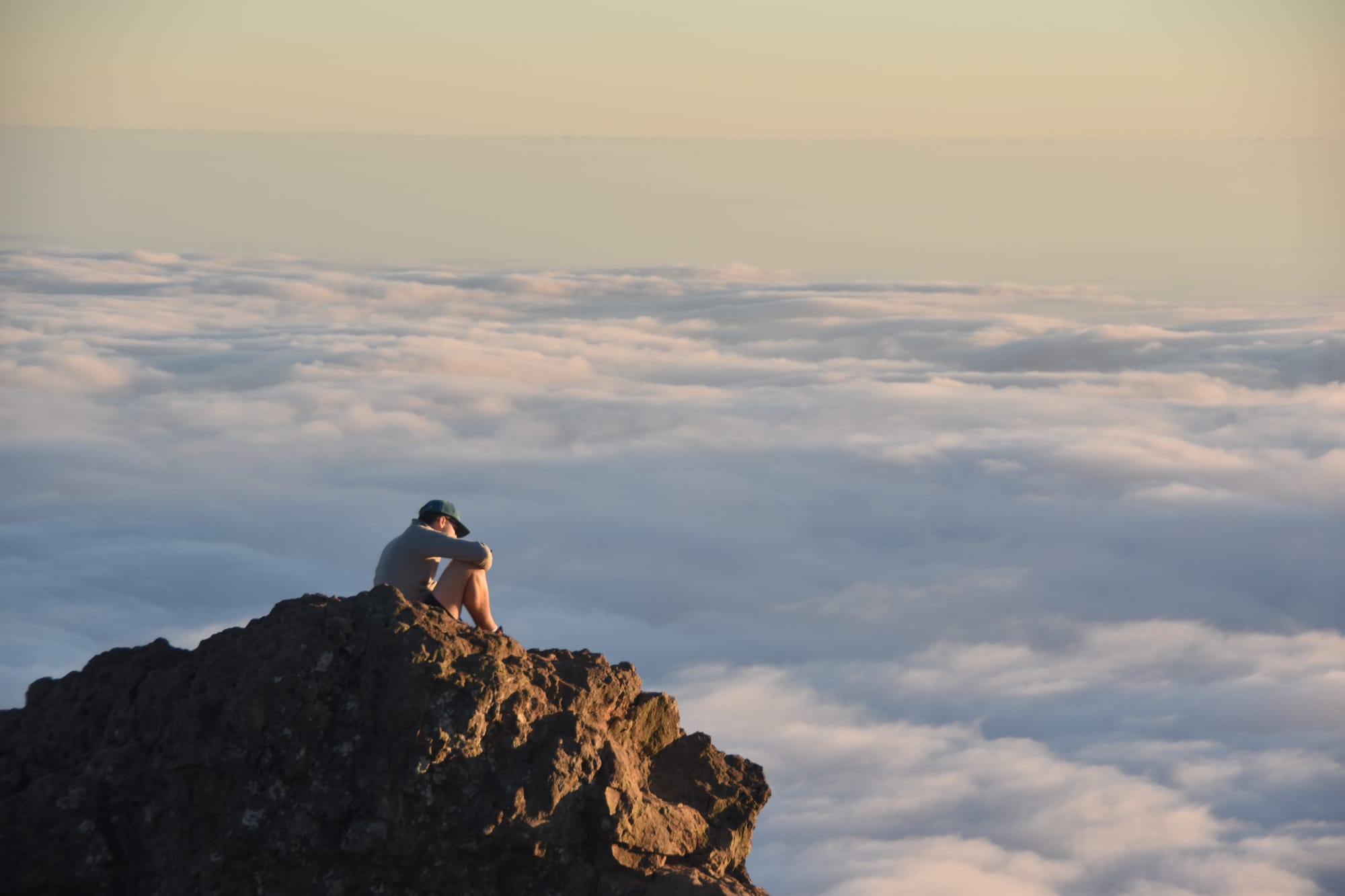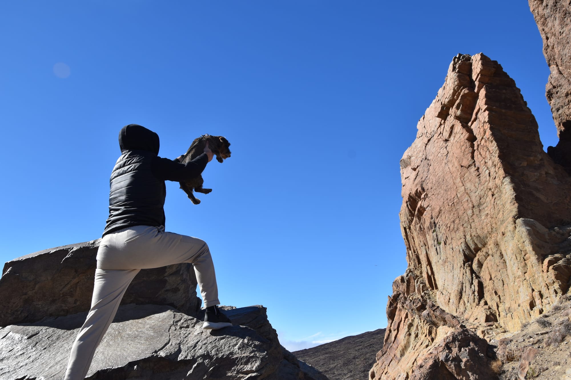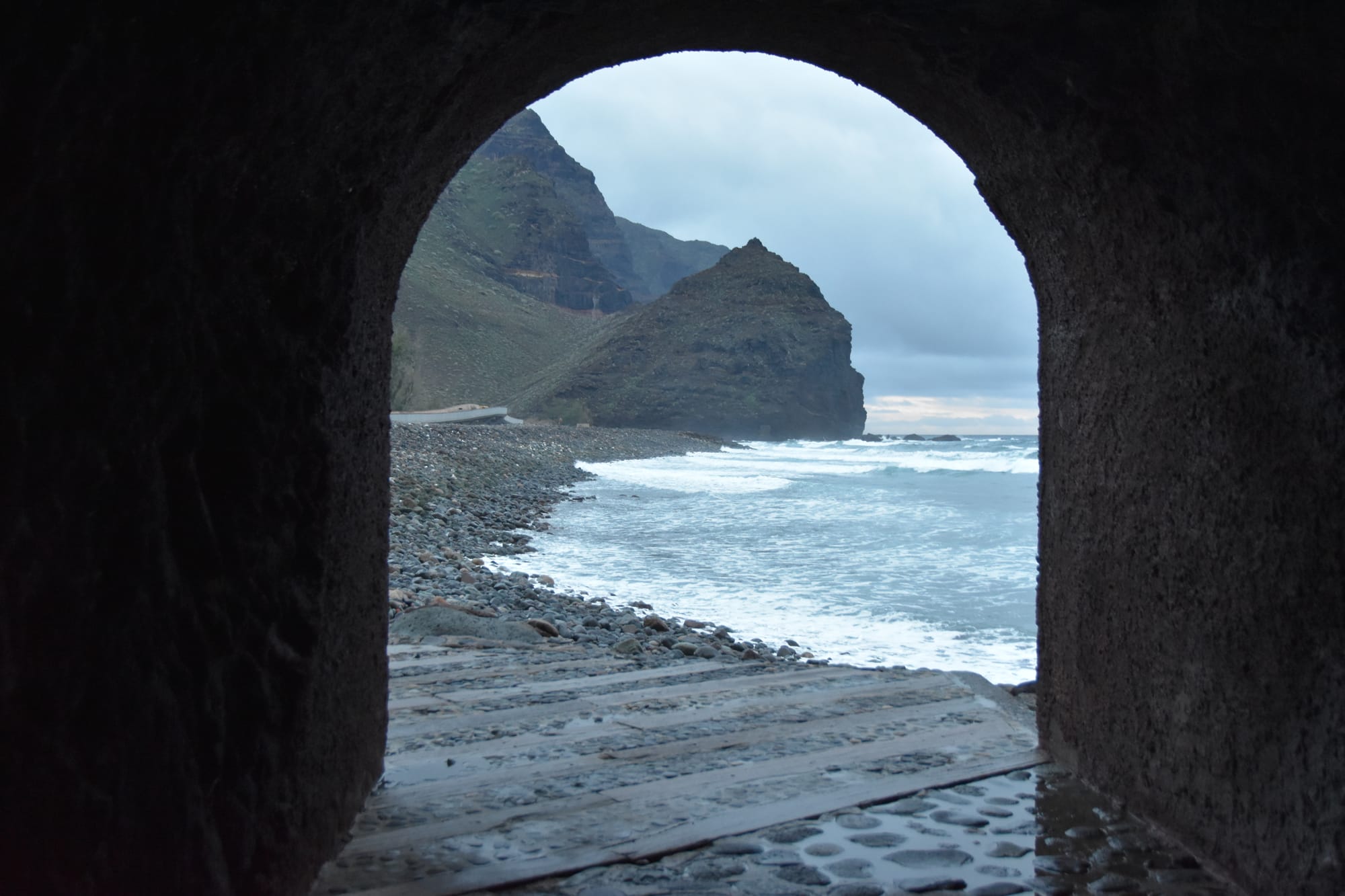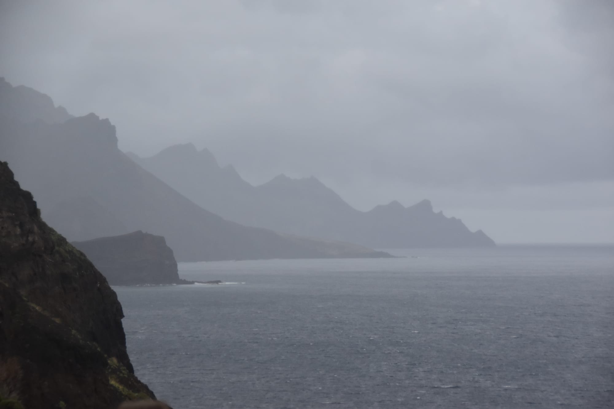 The northern part of the park was still very foggy, which actually made for some really awesome photos when it wasn't pure white-out from the clouds.The rocky landscape was absolutely insane.Some areas were covered in so much volcanic rock that it felt like you were on another planet.A funny random passerby struck this pose with his dog, and then kindly did it again when I asked. He told me to call him if this gets published in National Geographic.Ermita de las Nieves, a very scenic church near the peak of Mt. Teide.This is perhaps one of my favorite photos from the whole trip. Something about the composition and the mountains emerging dramatically from the clouds really captures the essence of the mountain, and the trip as a whole.The trip ended up taking a bit longer than expected, and we arrived in town right around golden hour. It was a beautiful way to enter into the warmer southern half of Tenerife.After a few days in the cold and rainy north, it was really great to be on the coast and with some warm weather. And check out those billowing clouds!The next day, me and Sarah went out kayaking with a group from an online rental tour. Here's a seaside cave that we passed by, shortly before snorkeling. The water was frigid, and there really wasn't much to look at. But still a fun time!