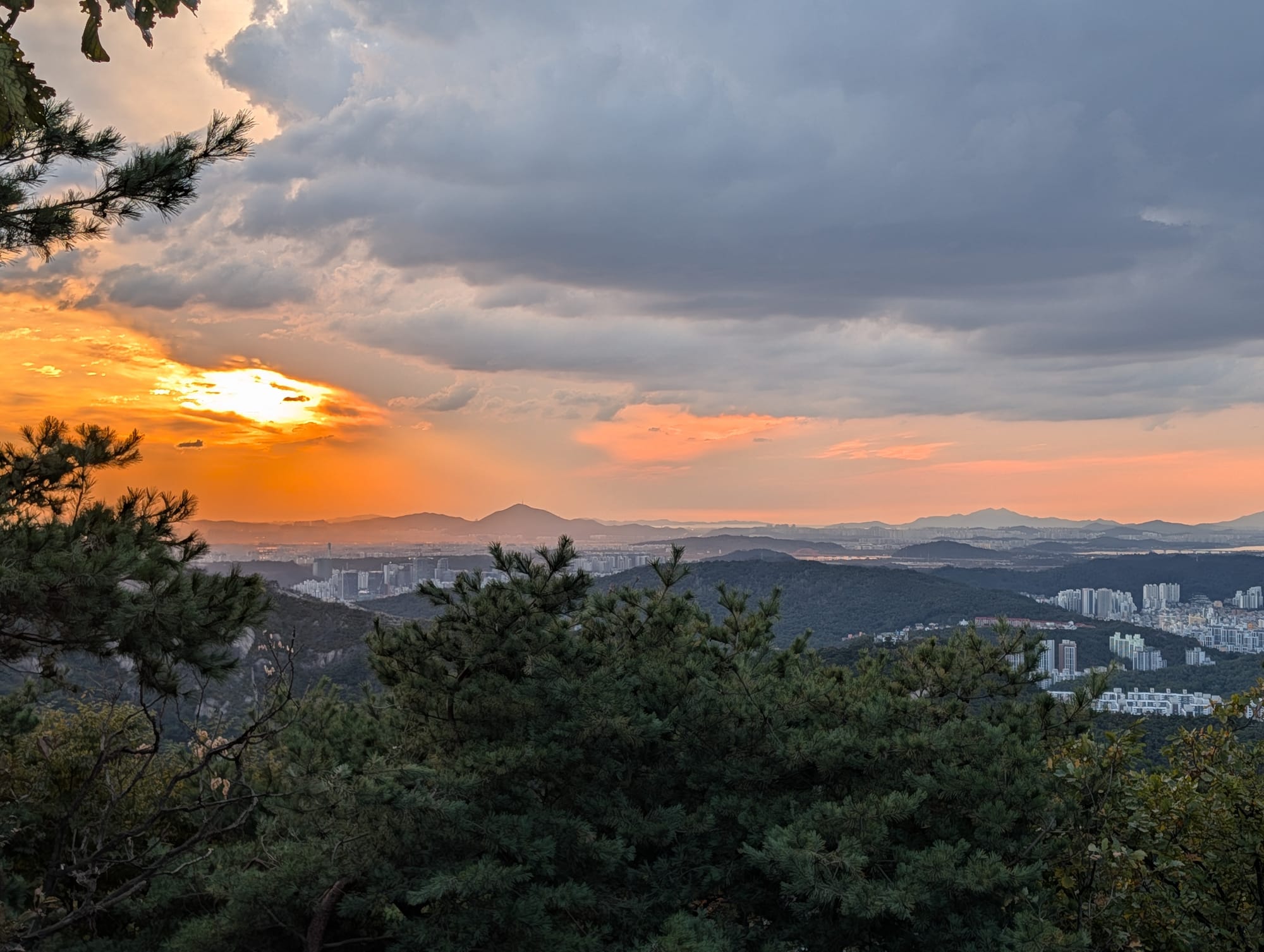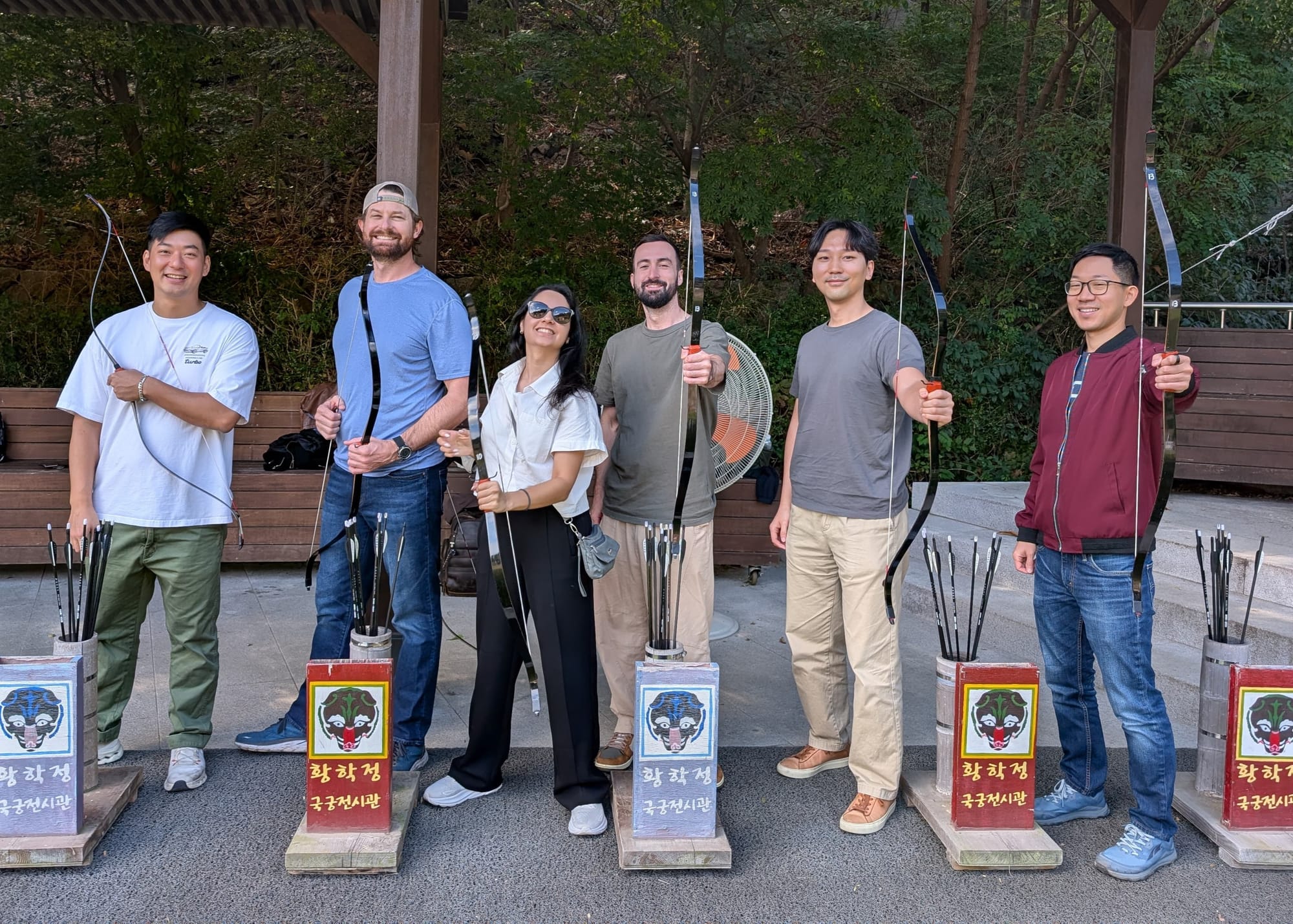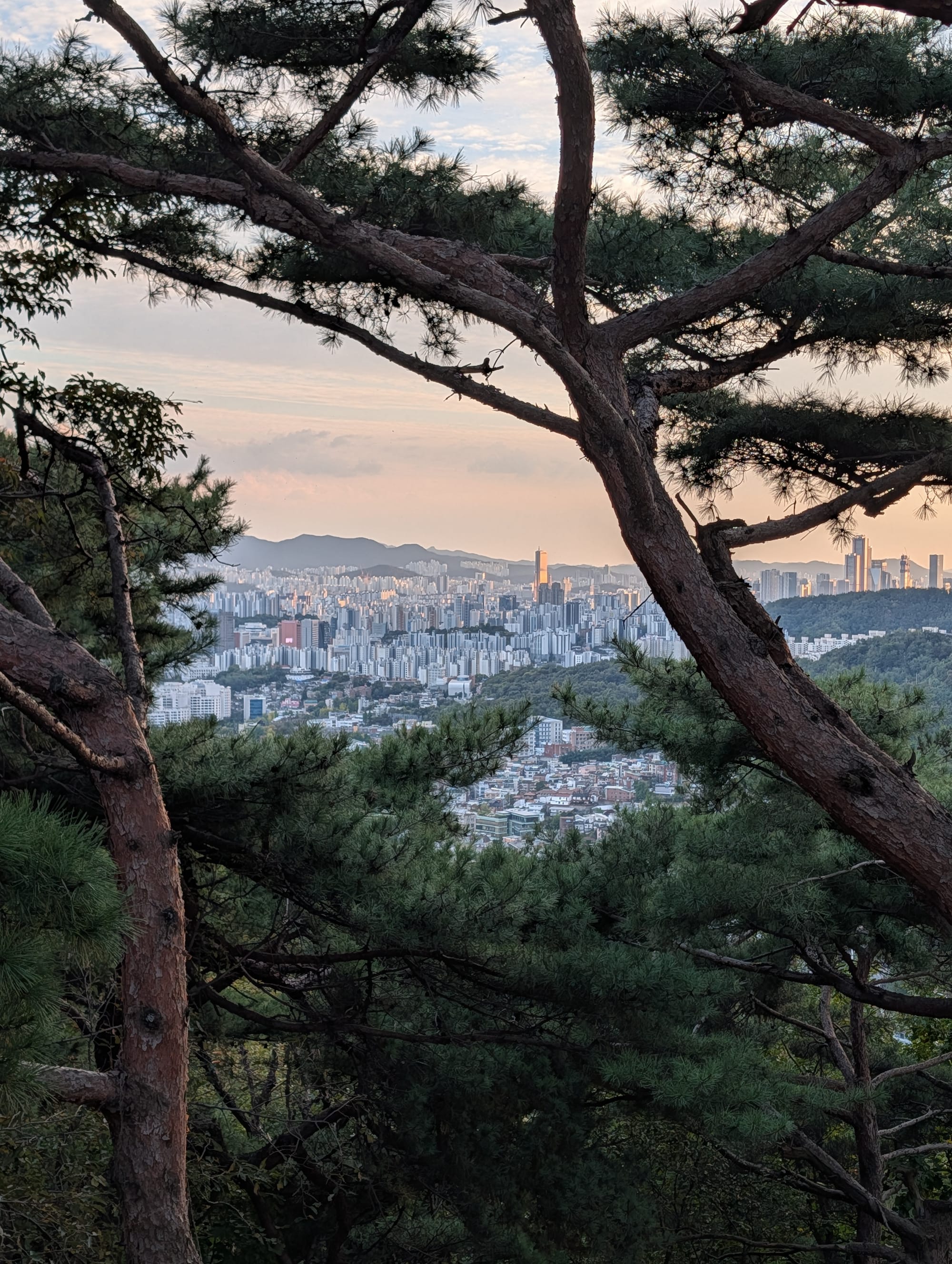The following day, I moved locations from the Airbnb near Hongdae street over to Gangnam district. That's where the Google office is, so I stopped in to admire the views and grab lunch.I spent a good portion of the day just as you see here: reading at a cafe. It's nice to revisit cities, because I can spend time doing things like this rather than feeling pressure to go sightseeing or maximizing my days.That night, I met up with some of the gang for dinner. Afterwards, we headed to Woori Super, which is a really cool craft beer spot. I actually visited this same place last time I was in Korea, and really enjoyed it both times.Nothing to add here, just being goofy with the gang 😄The next day, we headed off to an archery lesson. This was my first time trying archery, and it was way more difficult than I expected it to be. But loads of fun! From left to right: Phelix (the groom), Mike, Sonal, myself, Robert and George. Some more folks from the wedding group were here as well, but out of frame.I was feeling a bit socially drained after archery, and everyone else was going to visit Changdeokgung palace. I've already been, so decided to set off on my own. Following my time-tested rule, I just started walking whichever way gained elevation. This was a scenic residential area I passed on my way "up."Before I fully realized what was happening, my "idk just walking up" path ended up on a trail to the top of Bugaksan Mountain. This was a really beautiful hike, and I just so happened to be there right at sunset. There was also very few people on the trail.The views were really quite nice, and I just so happened to have brought my camera with me. I just kept going up, because after spending so much time in the city I was really in the mood to get out in nature and lose myself in my thoughts for a while.As I got closer to the top, the sunset really started to bloom. It was quite spectacular, and I felt really fortunate to have such a crazy set of coincidences: beautiful hike, great weather, no other foot traffic, and a gorgeous sunset to boot!One final photo to share - from the peak of the mountain. I was super sweaty, exhausted, and my legs were killing me. I didn't expect to go on such a long hike, and had a heavy backpack and clothes (including shoes) that weren't ideal for a long hike. Still super worth it!After the hike, I walked past a so-called "listening bar." Curious what that could mean, I ducked inside and ended up having one of the most memorable nights.