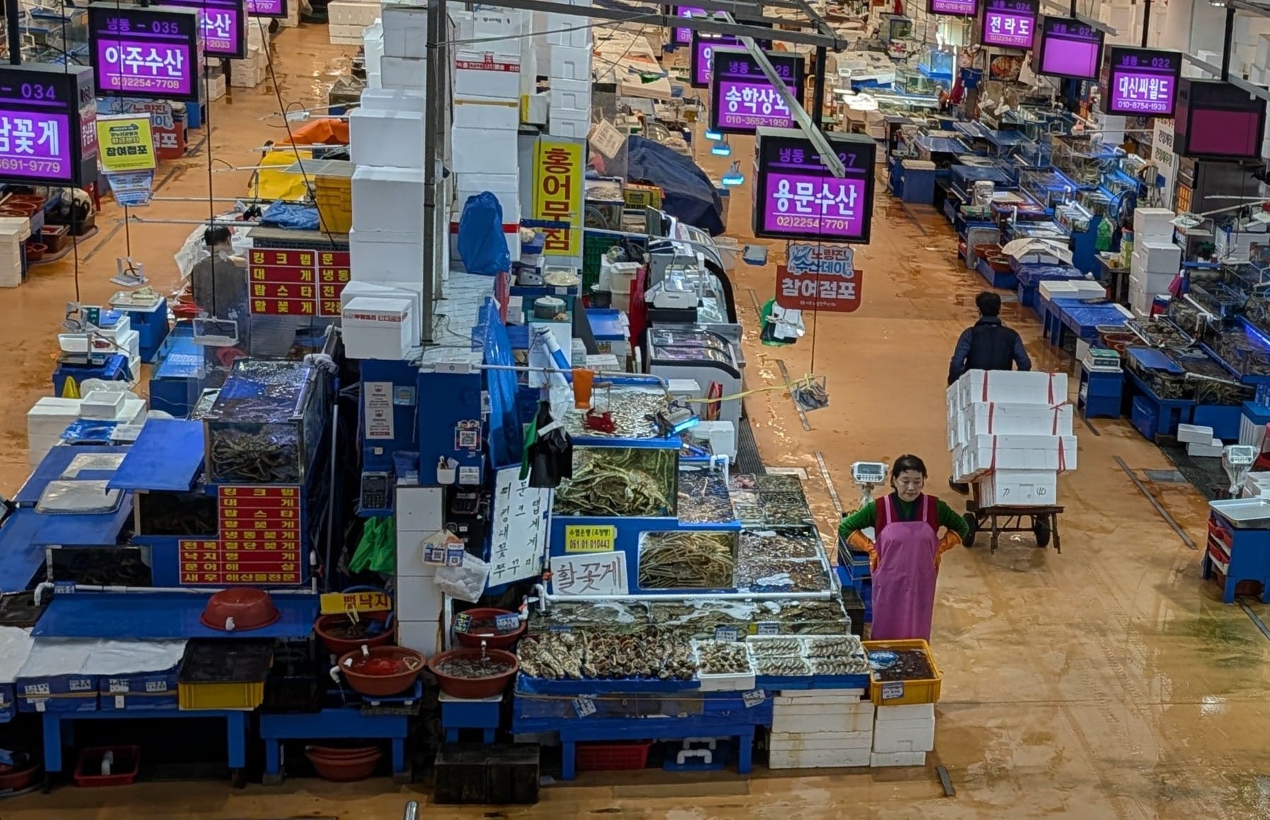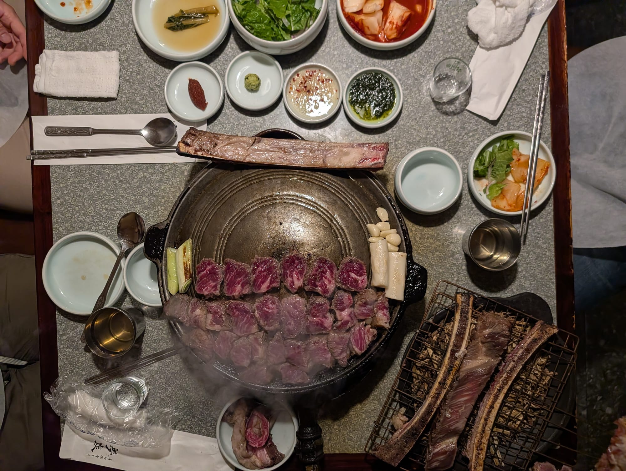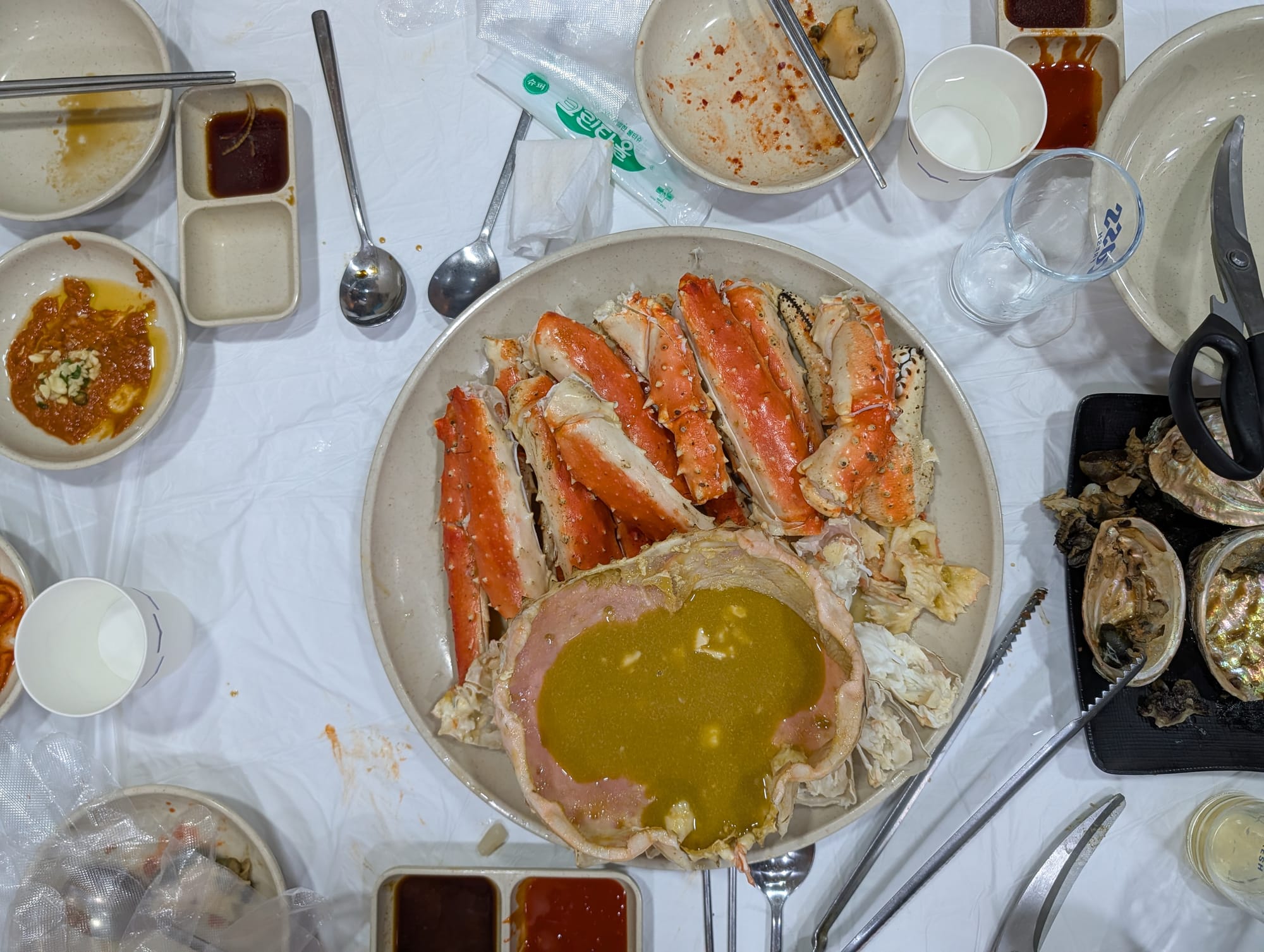 It was really "off to the races" for me on this trip. I landed in Seoul in the late afternoon, went straight to my hostel to drop off my bags, and then straight to dinner with my friends. They saw me coming in and snagged this photo, which made me feel like a celebrity!We were eating dinner at the NFW seafood market, which was a wild place. This is the lower floor of the market, which had tons of vendors selling fresh seafood, usually straight from the boat. They had any type of seafood you could possibly imagine.And when I say any kind of seafood, I truly mean it! This particular vendor had tanks of some kind of alligator, and flounder. I've never seen that before!In the market, you pick out your seafood (a huge king crab in this case) and the vendors will deliver it to the restaurants that are on the upper floor. Pictured are my friends Mike, Jani and Sonal.And just like that, the king crab becomes dinner! This was insane - just one leg of that crab had more meat than an entire normal-sized crab. Not an exaggeration! The shell was filled with crab butter for dipping. Afterwards, they take the rest and use it to make stir fried rice.After dinner, it was off to some swanky cocktails. It's getting harder and harder to find places that do smoke-infused drinks, so when I saw this one I had to get it.The next day, we slept in late (as should be expected on vacation) and then headed out to walk around town. We stopped in for lunch at this nice Korean stew place.Here was another serendipitous find - 글로우 성수 (Glow Seongsu), which was a dining hall tucked away in the city with a very nature-centric decor. There were a few restaurants all connected to this spot, and we liked it so much that we came back again the next night.The next day was a bit uneventful, more wandering around the city exploring. As night started to settle in, we decided to check out some cocktail bars. This was Zodiac, which had a really cool theme. All the cocktails were based on zodiac signs, and the decor matched. Unfortunately the cocktails themselves were just alright...