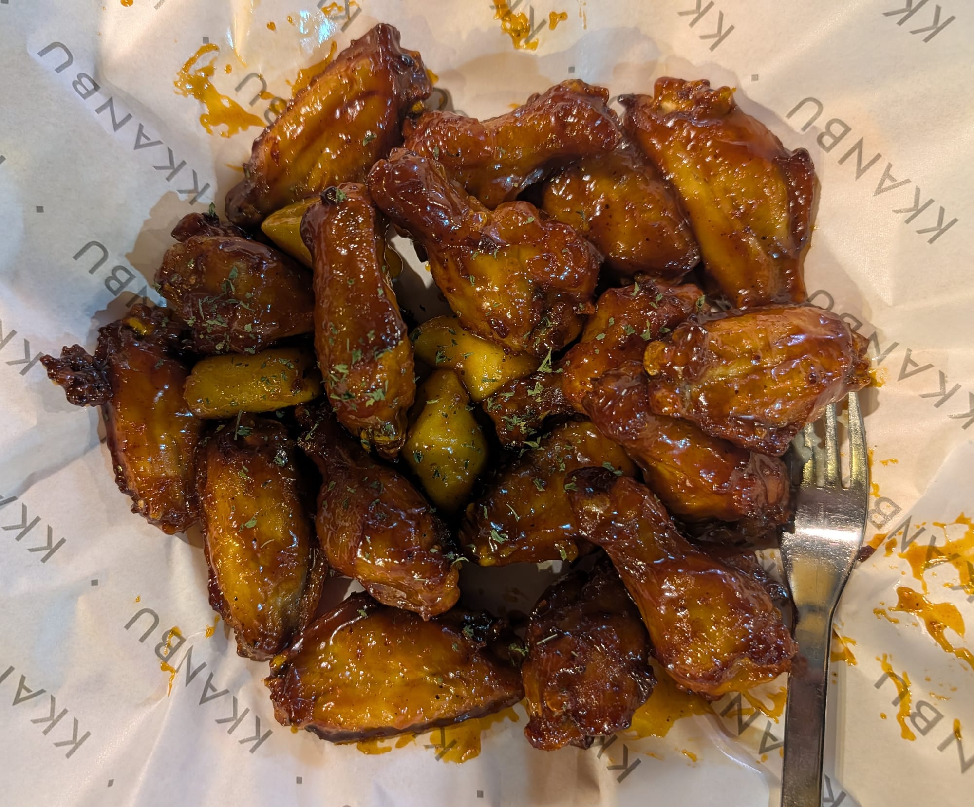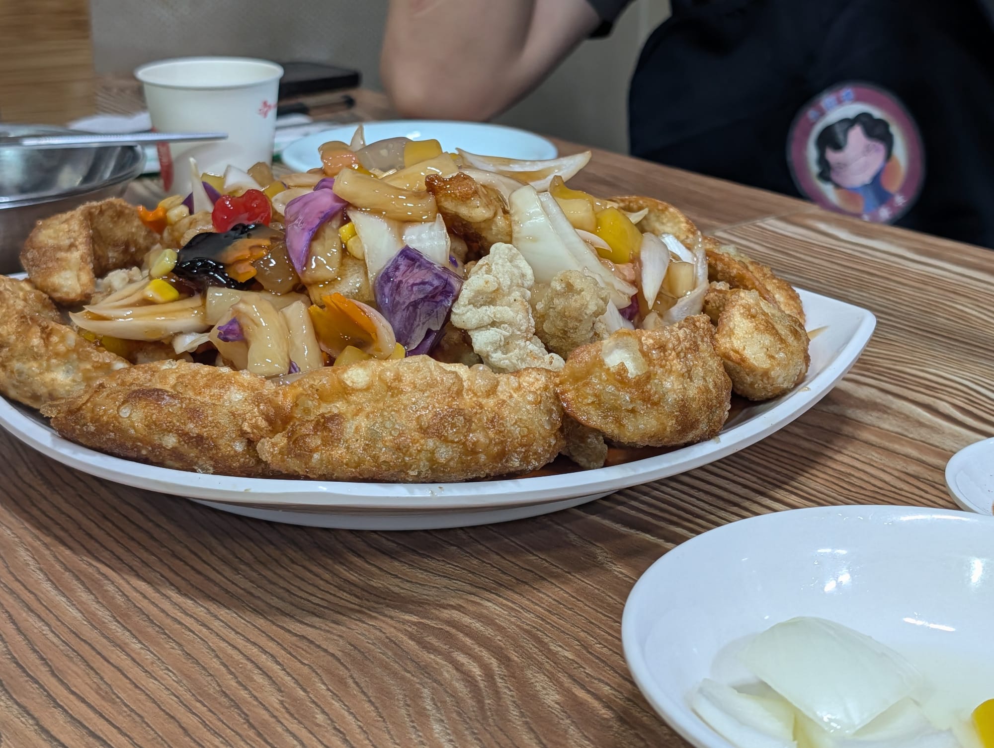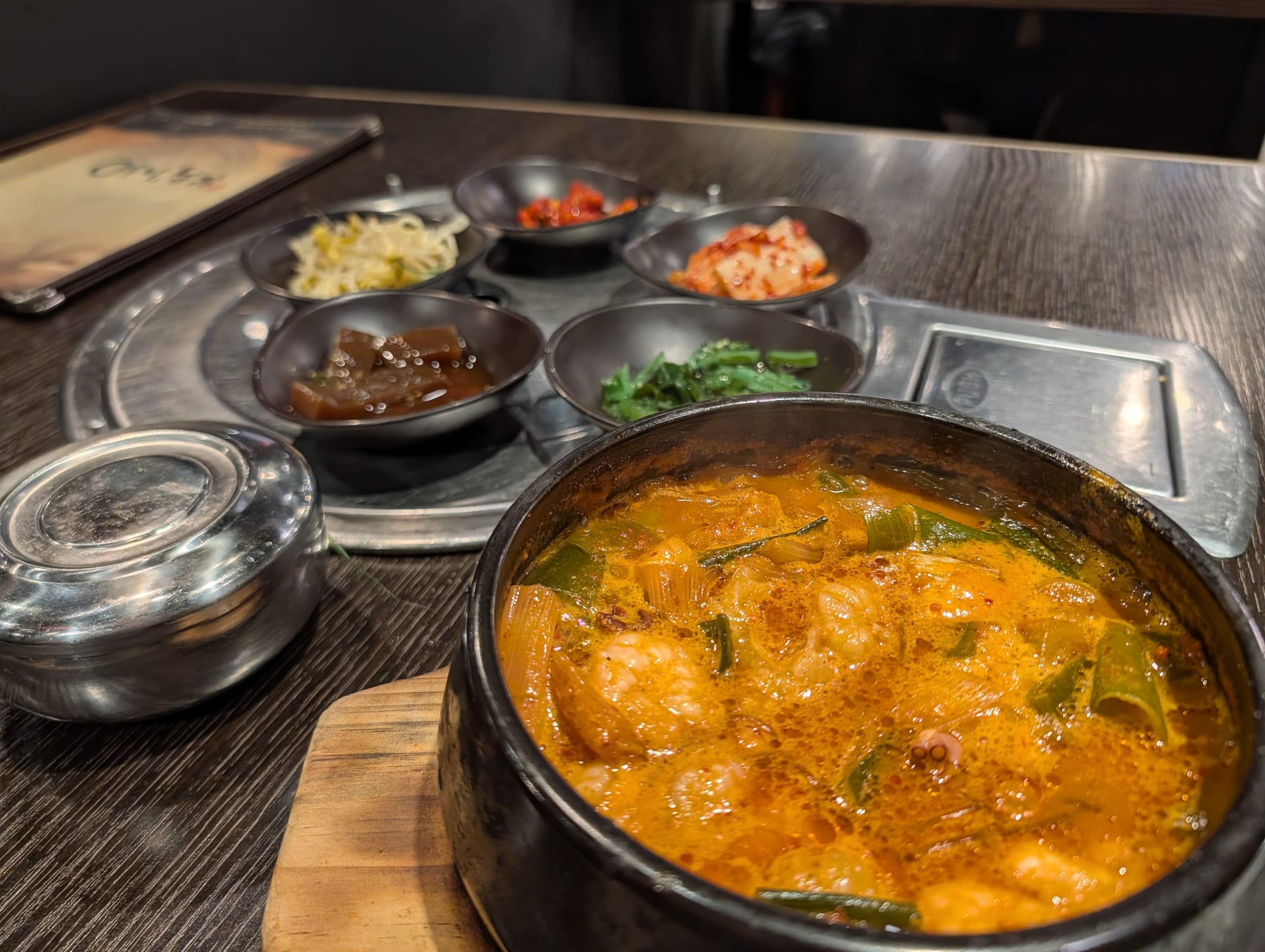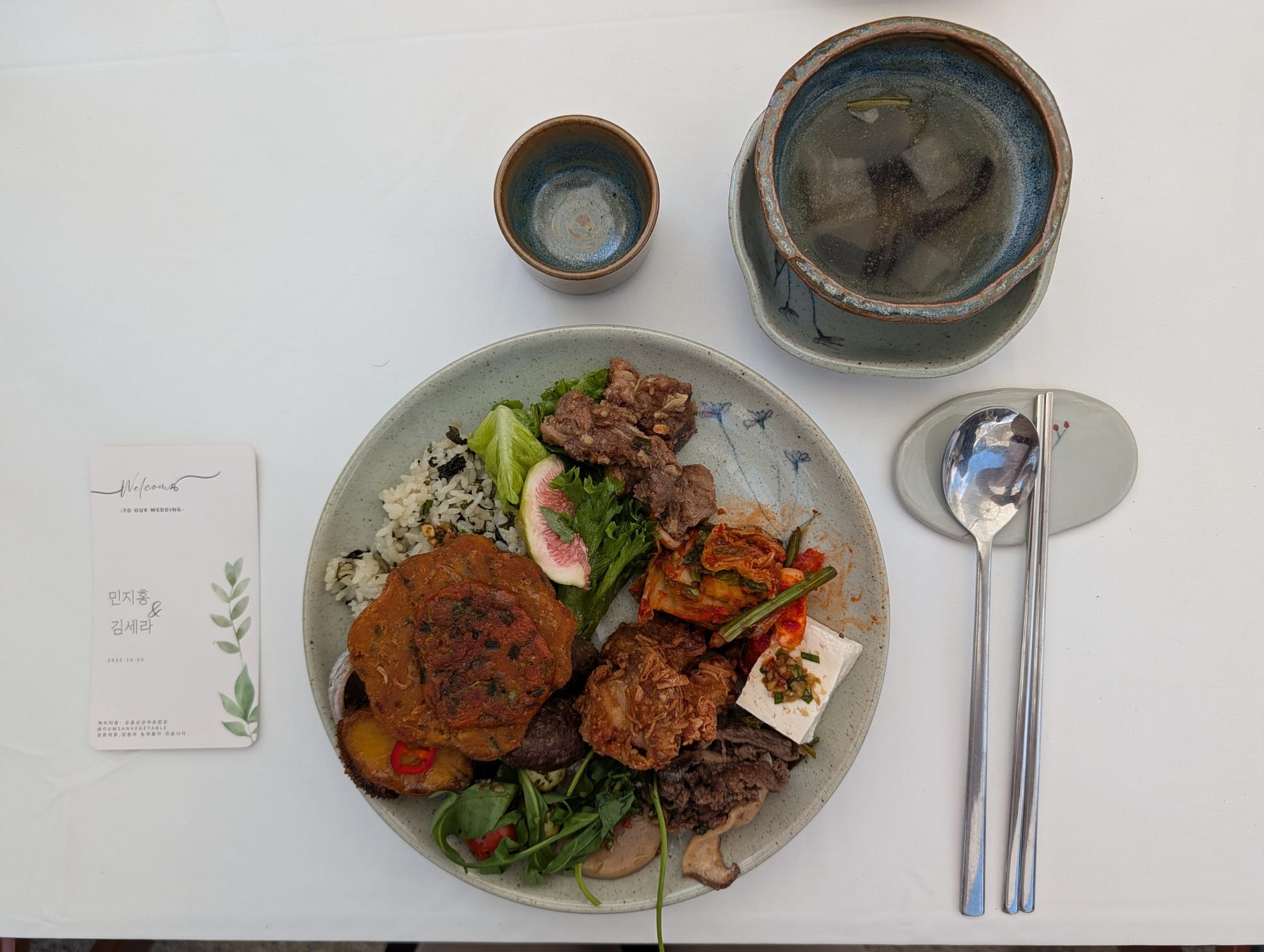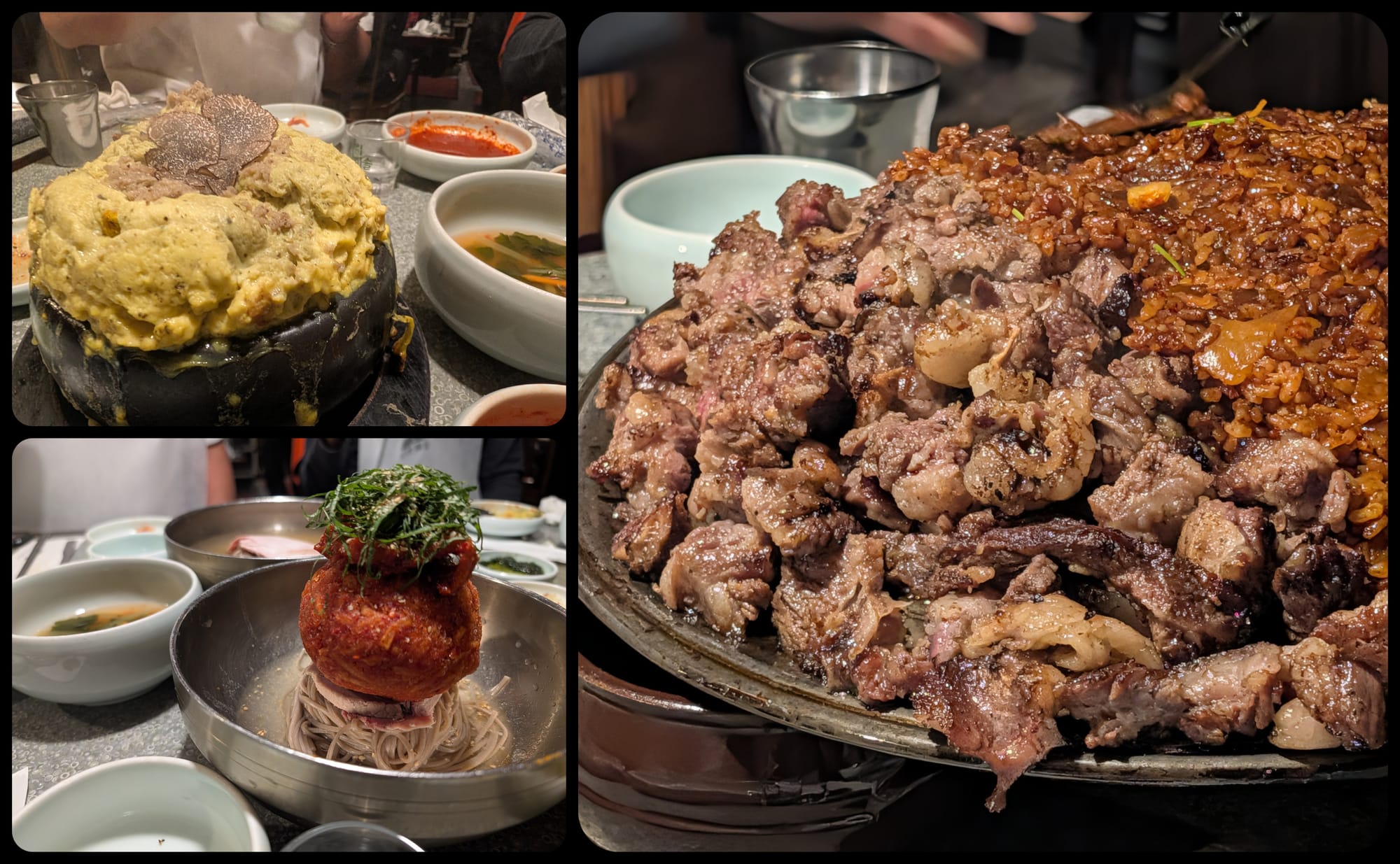 Here's some more seafood from the NFW market. Sashimi and abalone.I found this little hole in the wall one night. The owner didn't speak any English, so I just shrugged and pointed at something on the menu. I wasn't disappointed! A variety delicious chicken skewers.I walked by Koriko Cafe one day, and the entrance was compelling enough to pop in. I wasn't disappointed, and it's apparently a really popular spot! These edible desserts were especially cute, but the coffee was great and other pastries looked amazing!A big plate of authentic and delicious Chinese food from YeongHwaRu. This is going to sound crazy, so bear with me here. Fried chicken, topped with what I'd describe as a egg salad. It was absolutely phenomenal.A really great cocktail from Cobbler. On brand with their name, every drink came with a tiny souffle cup of fresh-baked blackberry cobbler. Delicious!Some of the (many) foods served at the wedding. It was buffet style, with a huge spread of tons of delicious foods. I couldn't stop eating!One of the best meals I had while in Korea; grilled short rib from Mongtan.Some more shots from Mongtan. On the right, they cut up the leftover shortrib scraps and made a delicious fried rice. On the top left there's truffle steamed egg, which might have been my first time having fresh sliced truffle! And on the bottom right was what I can only describe as a kimchi ice cream cone. It sounds gross, but was one of my favorites.What trip to Korea would be complete without a drunken, late-night Korean fried chicken indulgence? This was from the chain restaurant Kkanbu, and it was incredibly delicious. Sticky, sweet, and the perfect amount of spicy! I tried to finish the plate myself, but alas even my drunken munchies were no competition to this amount of food.The next morning, I was recommended by the Koreans in the group chat to find Haejang-guk, or "hangover stew." I couldn't be bothered to find that in particular, but went with a hearty stew close to it. It hit the spot, and I think they might be onto something with this cure!